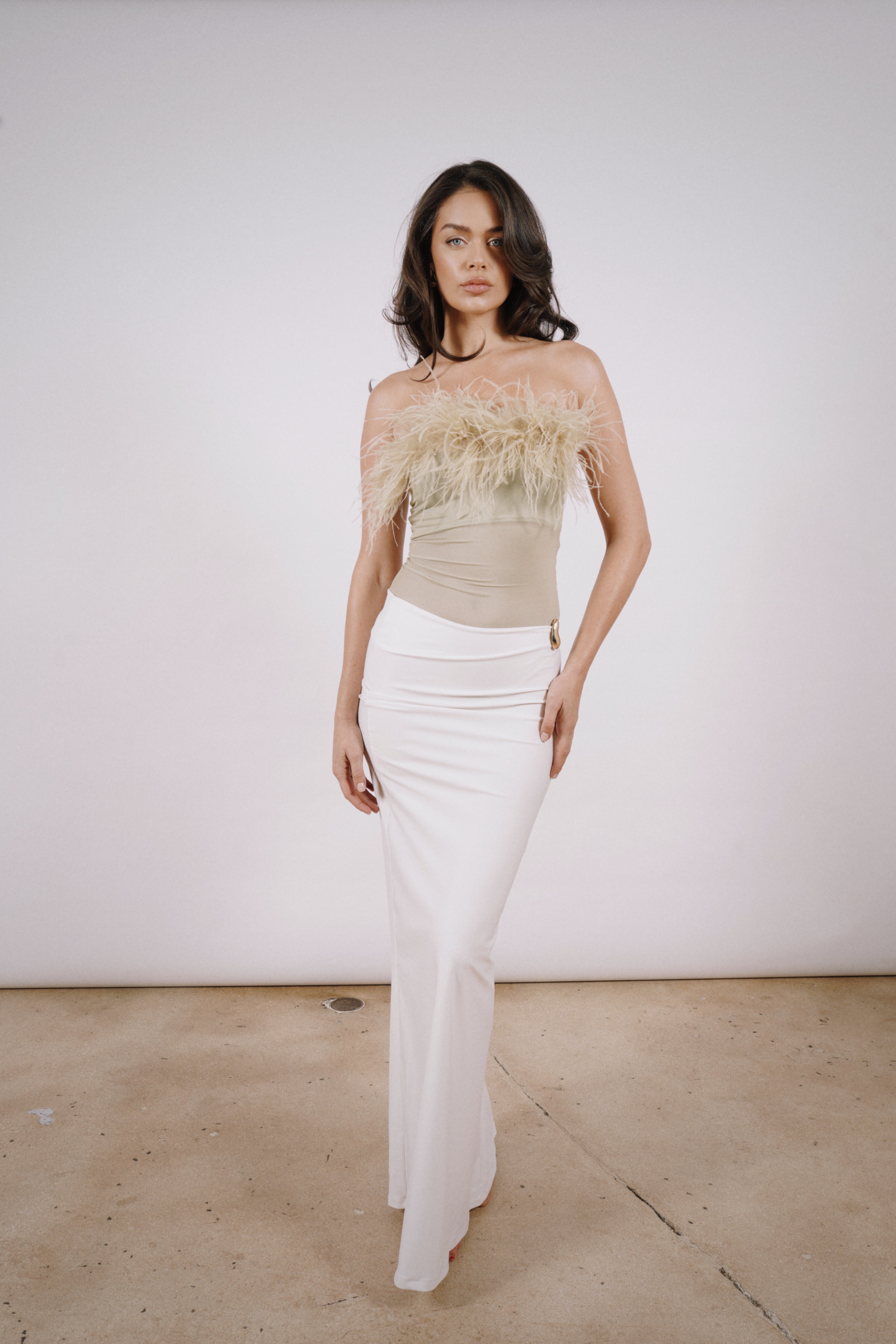 Romantic with a touch of glam. This strapless bodysuit features a feather-trimmed neckline that frames the bust with softness and elegance. The perfect piece for events, night outs, or any moment when you want to stand out.