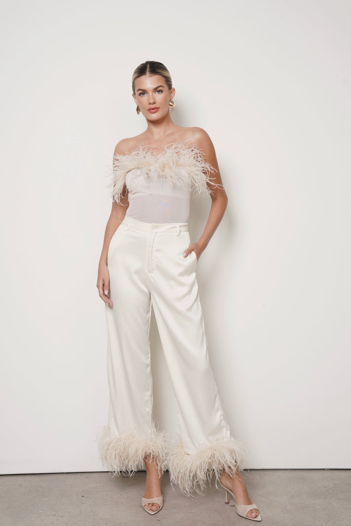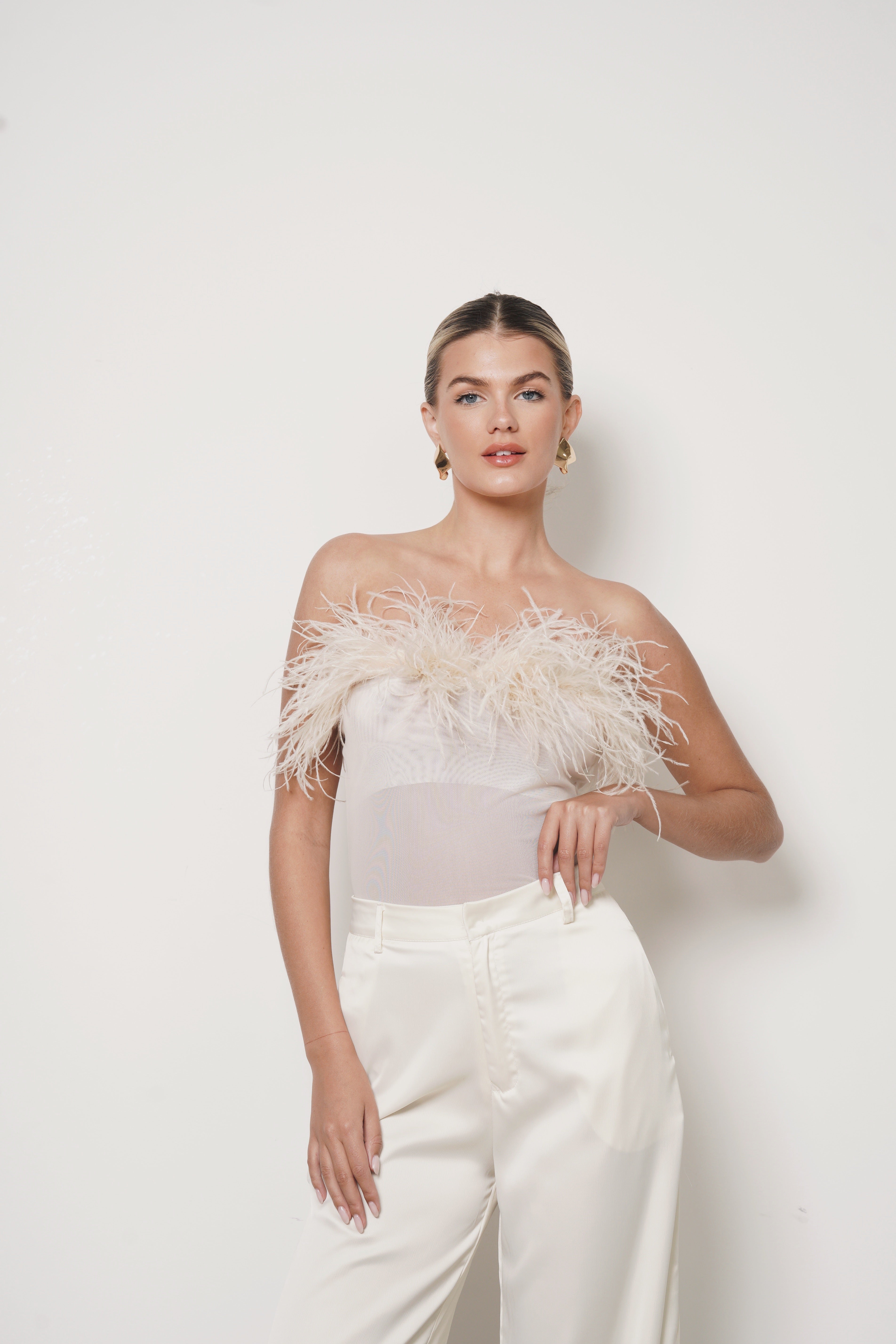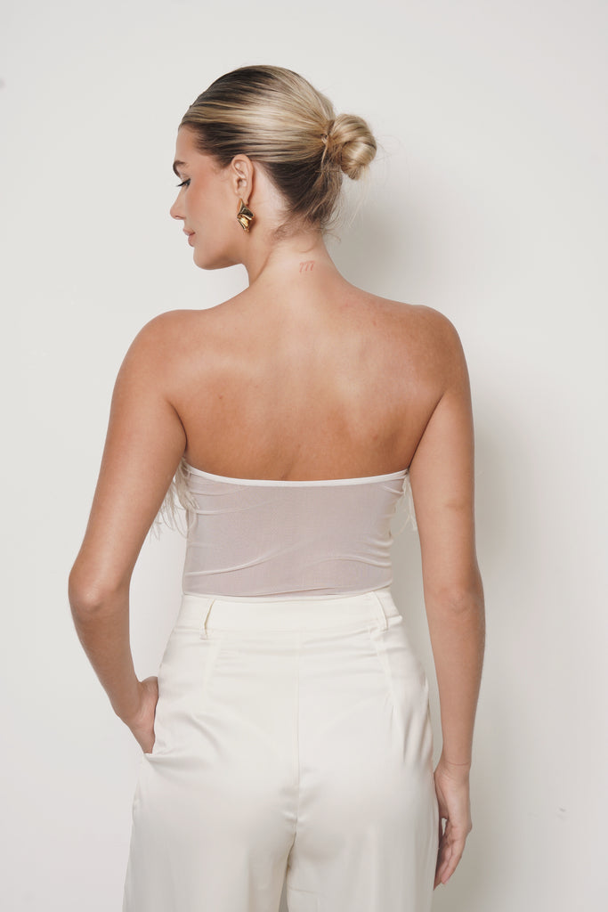 Romantic with a touch of glam. This strapless bodysuit features a feather-trimmed neckline that frames the bust with softness and elegance. The perfect piece for events, night outs, or any moment when you want to stand out.