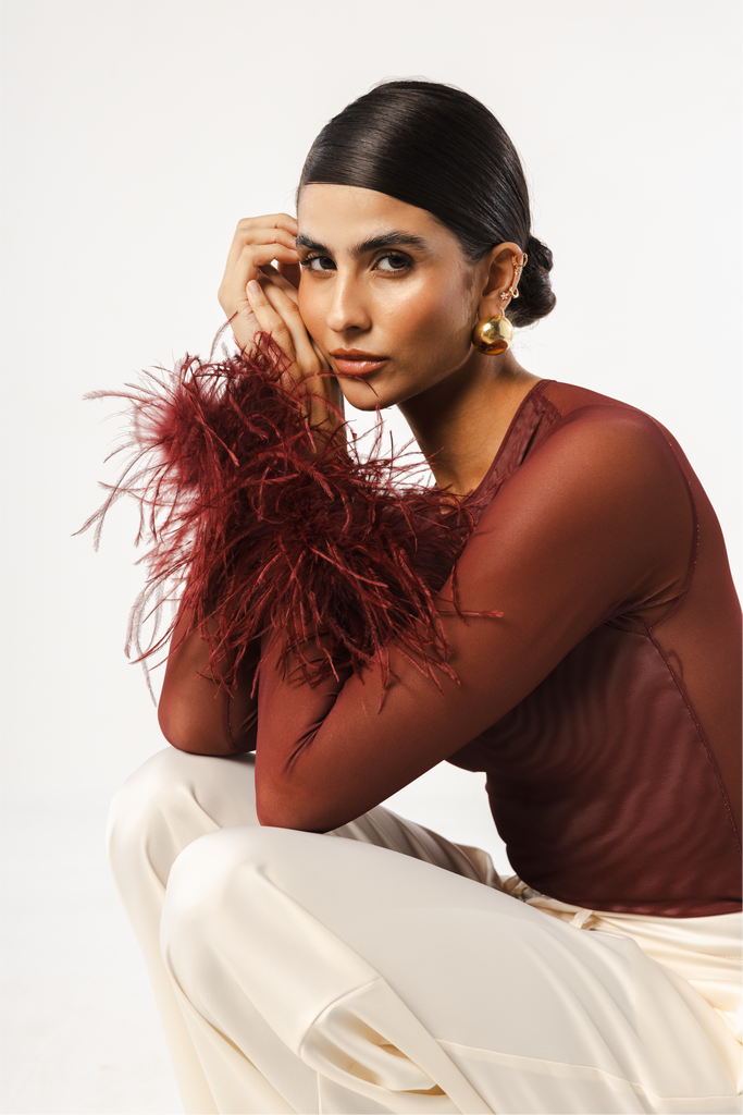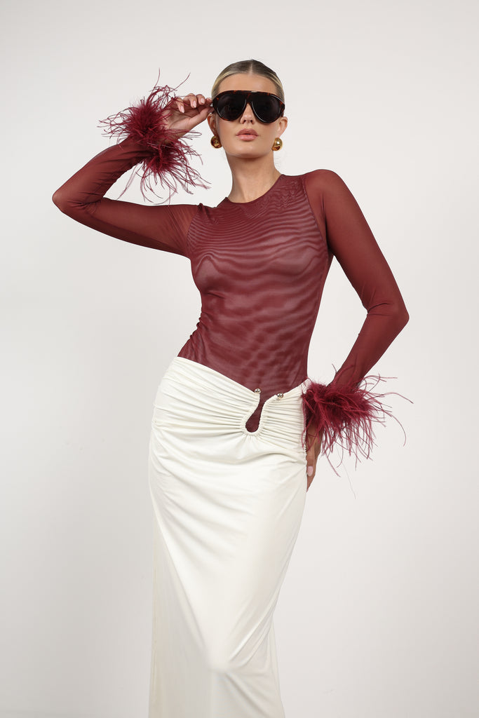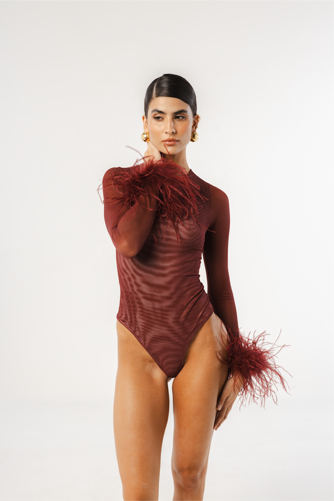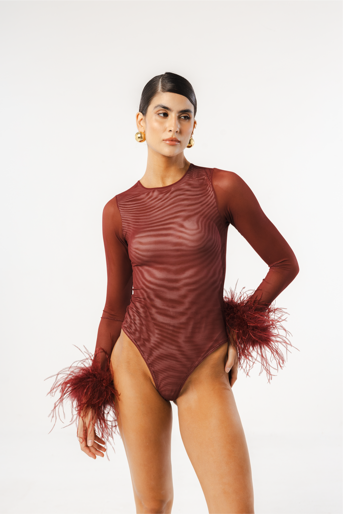 A new edition for lovers of our iconic mesh bodysuit. The Swan Bodysuit blends sensuality and elegance with tone-on-tone feather-trimmed sleeves. Layers of soft mesh are carefully draped to provide more coverage at the front, creating a refined sensuality that flatters the figure, while the sleeves remain sheer for a touch of allure. Its classic single-layer mesh back design enhances the silhouette. The feathers are removable for washing to preserve their quality, as they should not be washed.