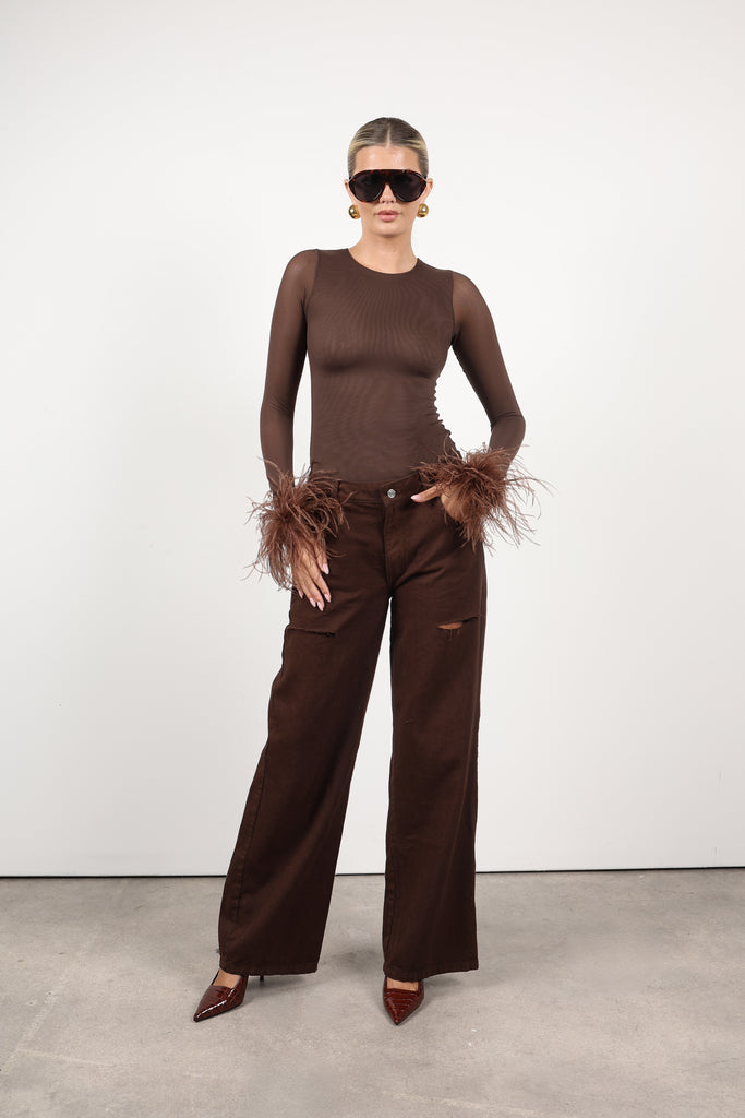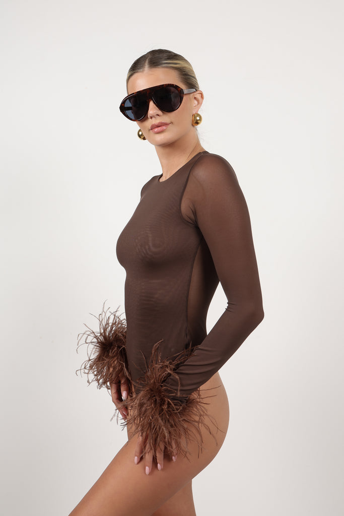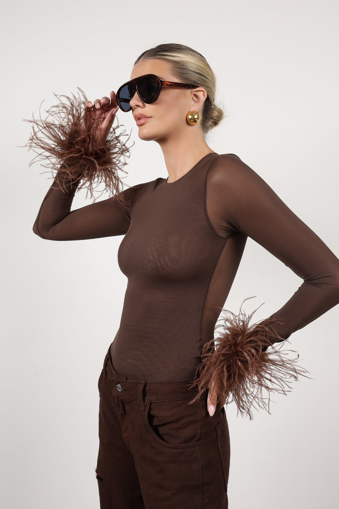 A new edition for lovers of our iconic mesh bodysuit. The Swan Bodysuit blends sensuality and elegance with tone-on-tone feather-trimmed sleeves. Layers of soft mesh are carefully draped to provide more coverage at the front, creating a refined sensuality that flatters the figure, while the sleeves remain sheer for a touch of allure. Its classic single-layer mesh back design enhances the silhouette. The feathers are removable for washing to preserve their quality, as they should not be washed.
