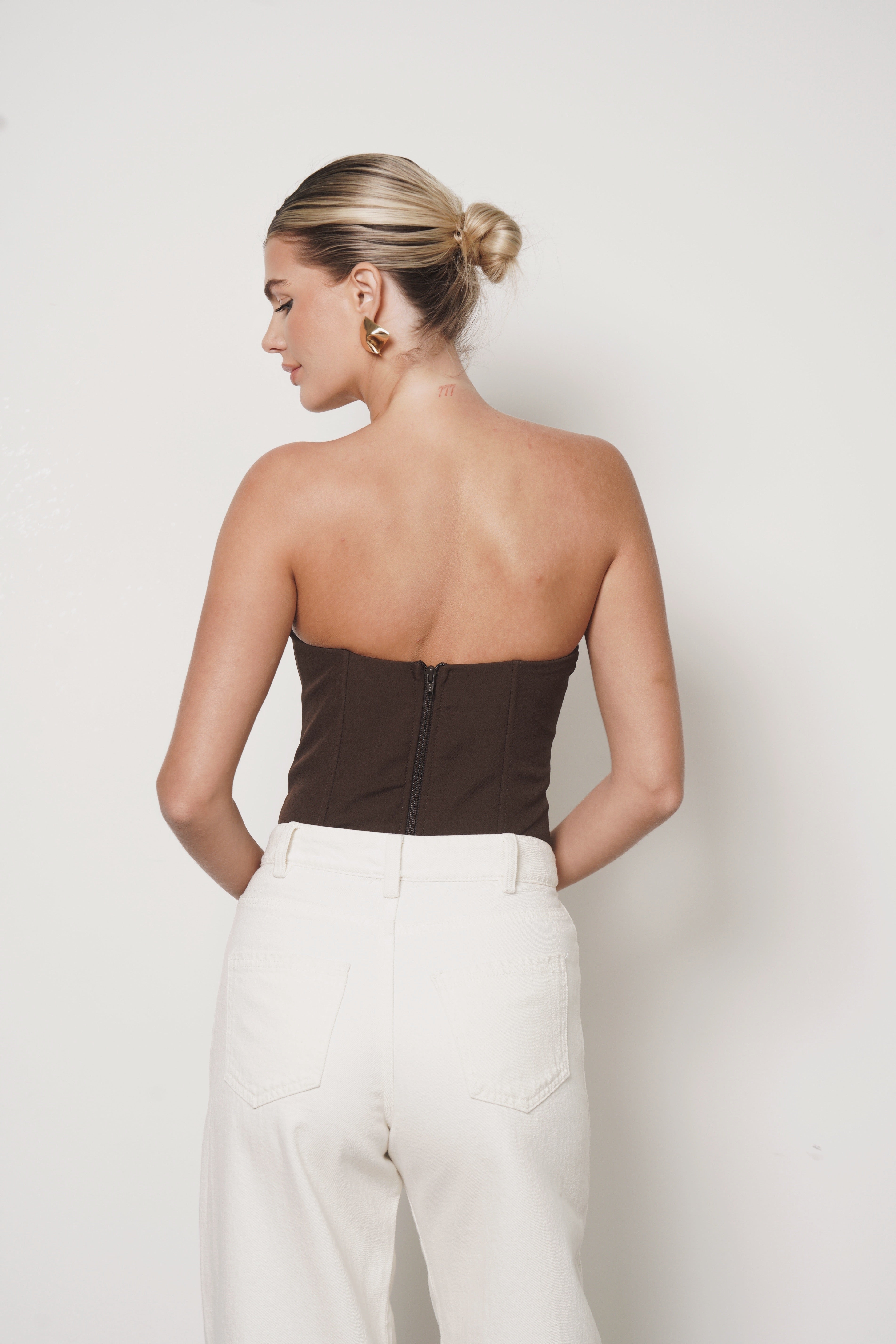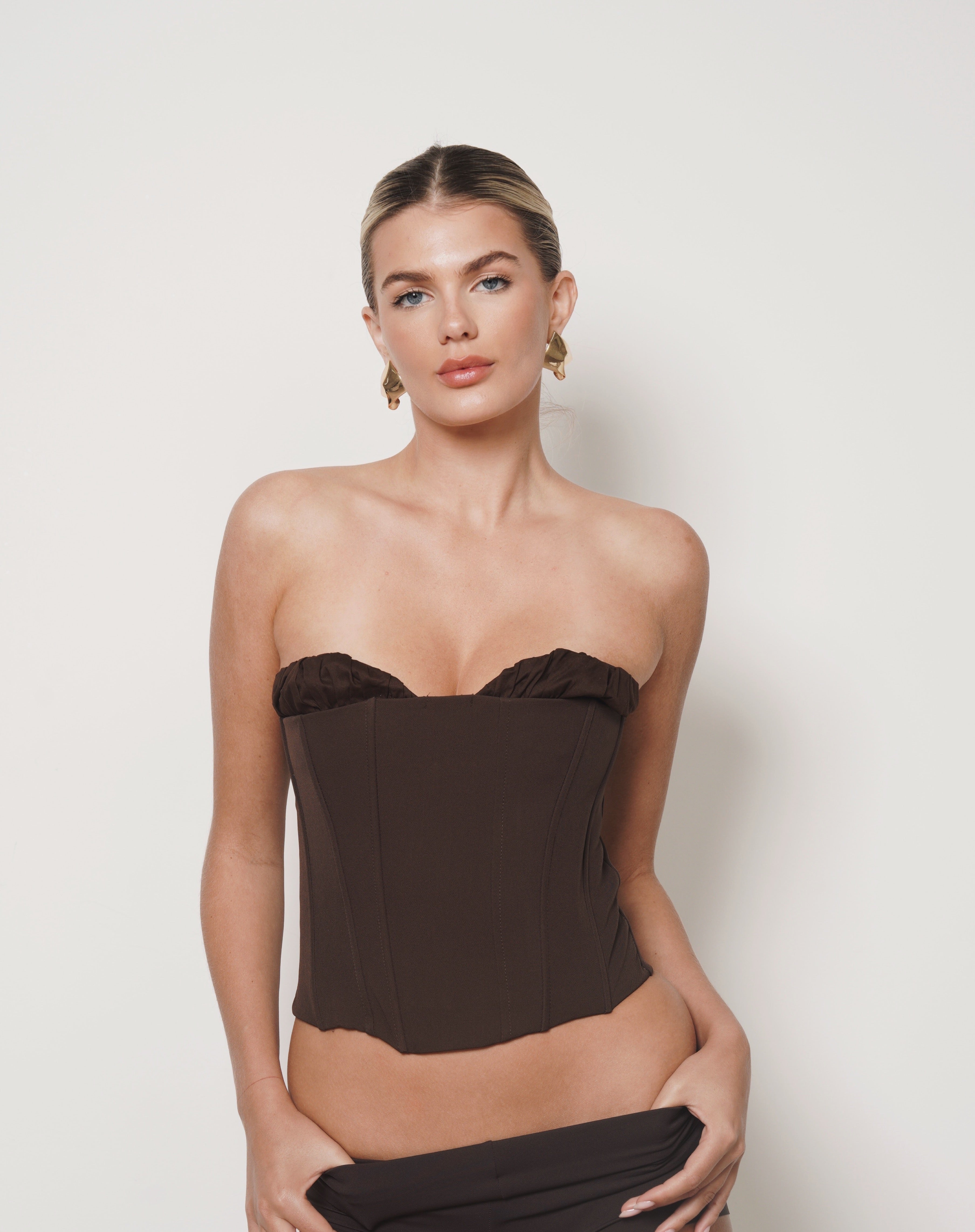 A reinvention of one of our classics. Own your style with our monochrome corset — a masterpiece of elegance and femininity. Crafted in a structured fabric that sculpts the waist and finished with a back closure, this corset ensures a flawless look for any occasion. The cups feature delicate pleating that elevates the entire piece.