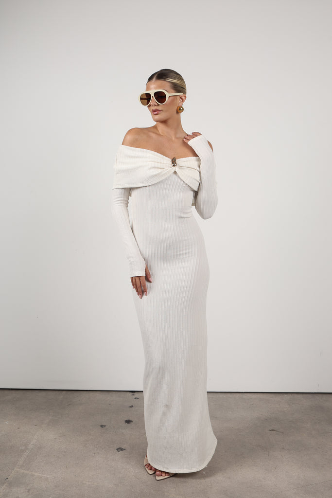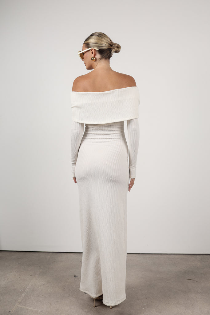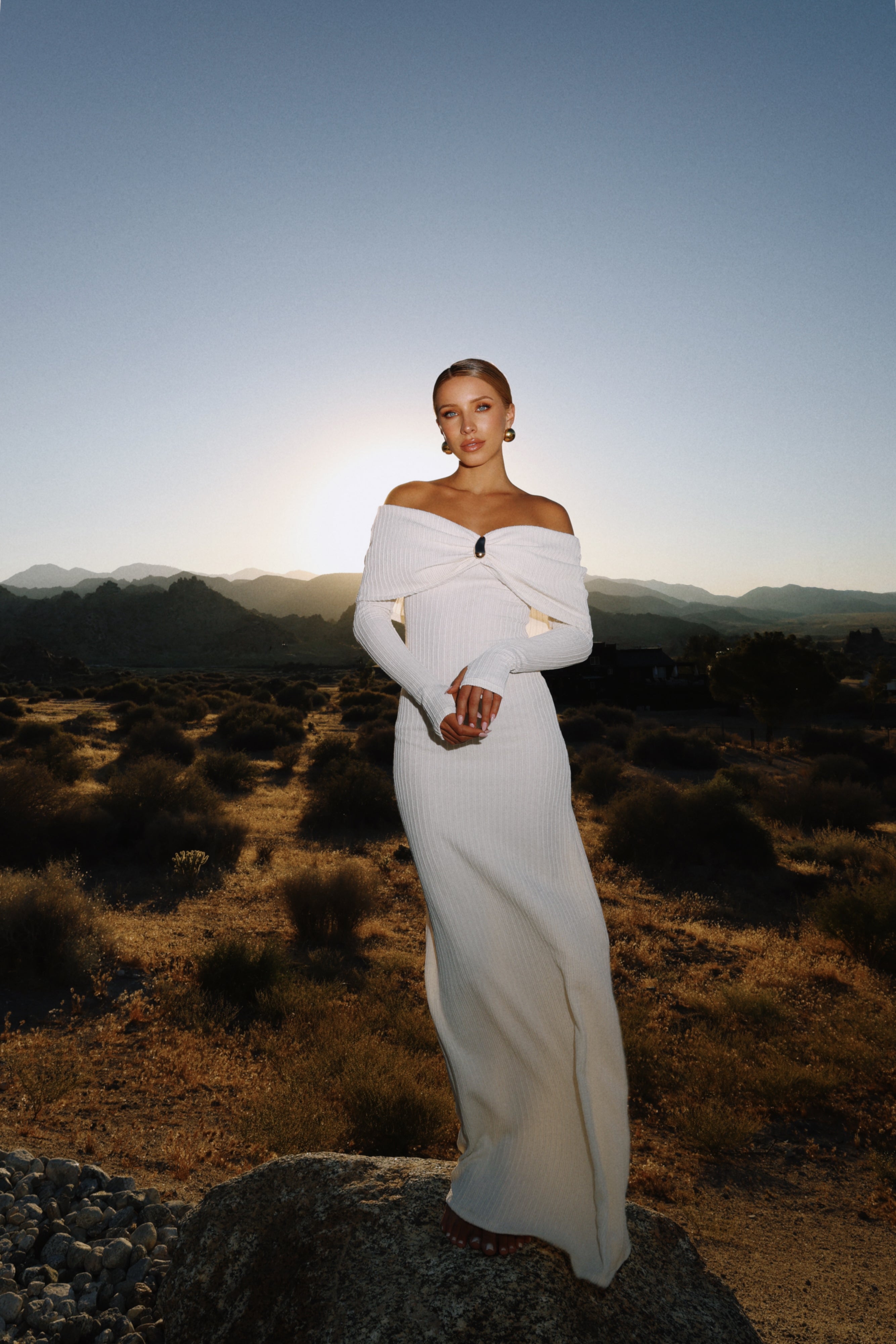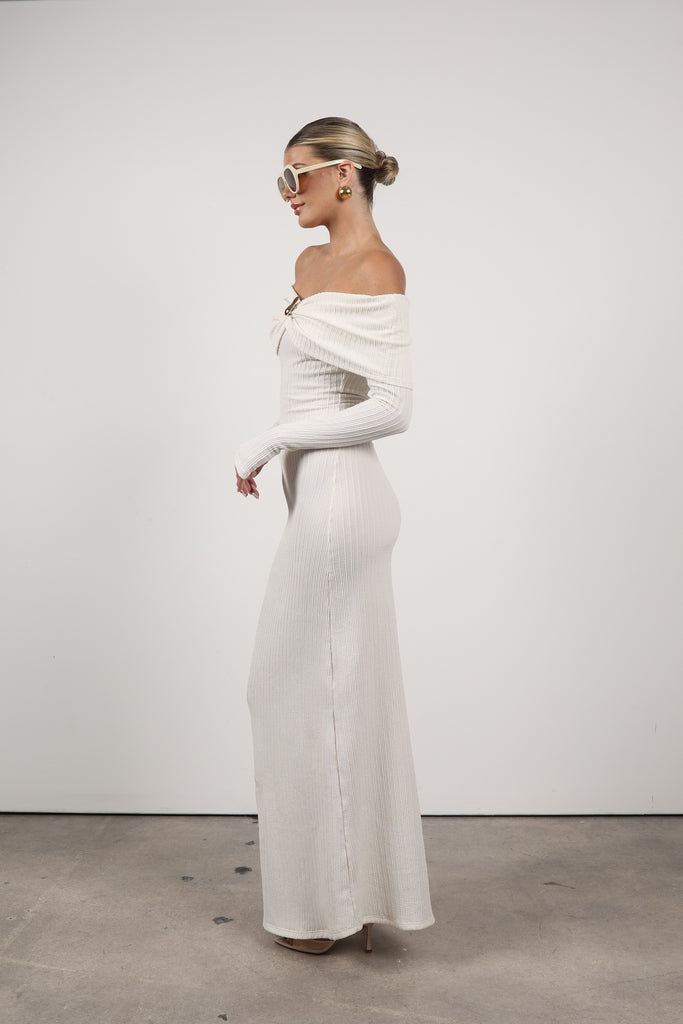 Minimalist elegance at its finest. This long dress stands out with its off-the-shoulder neckline and a unique detail that subtly elevates the design. Crafted from soft, fluid fabric, it embodies the perfect balance between simplicity and sophistication.