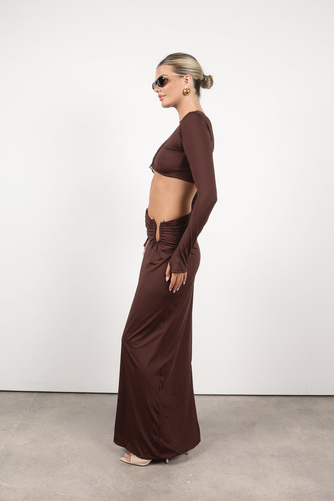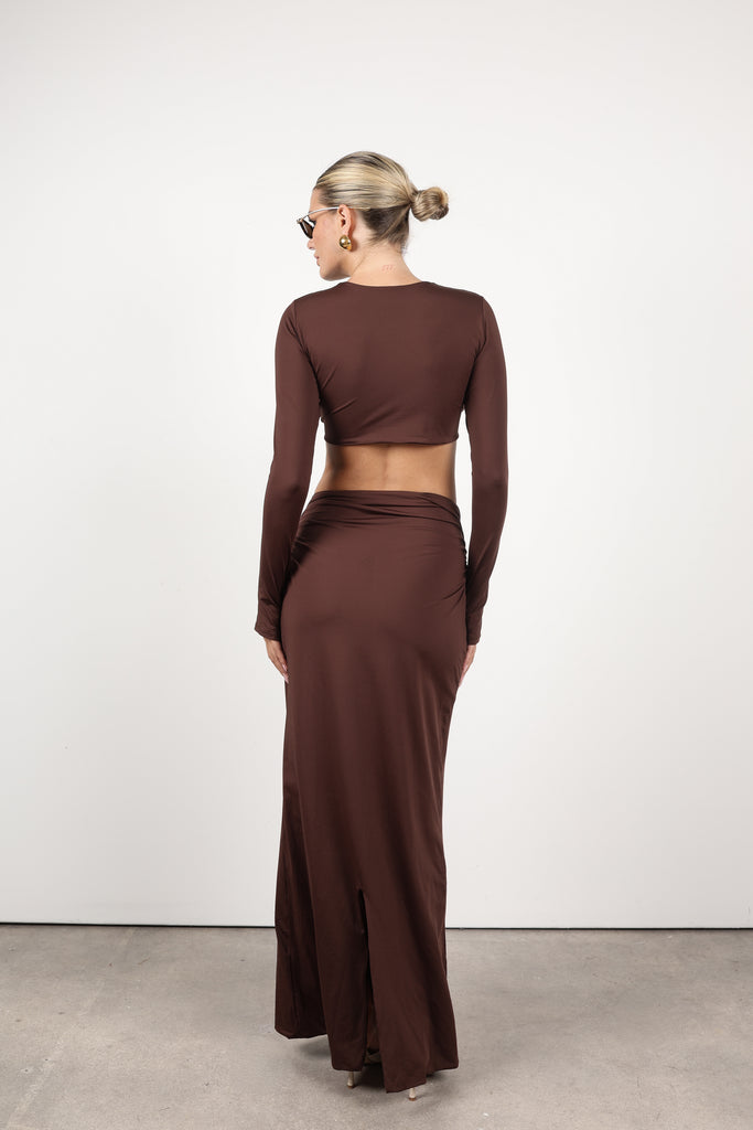 Designed in fine stretch fabric, this set pairs a long skirt with a long-sleeved crop top featuring subtle hardware details that instantly elevate the look. Timeless yet modern, it’s a proposal that blends elegance and sensuality with a sophisticated edge.