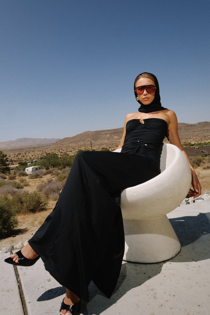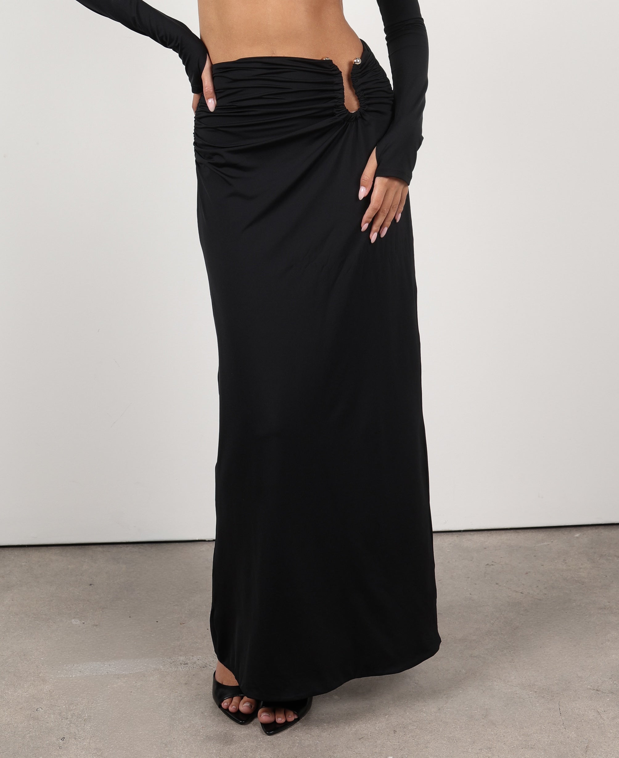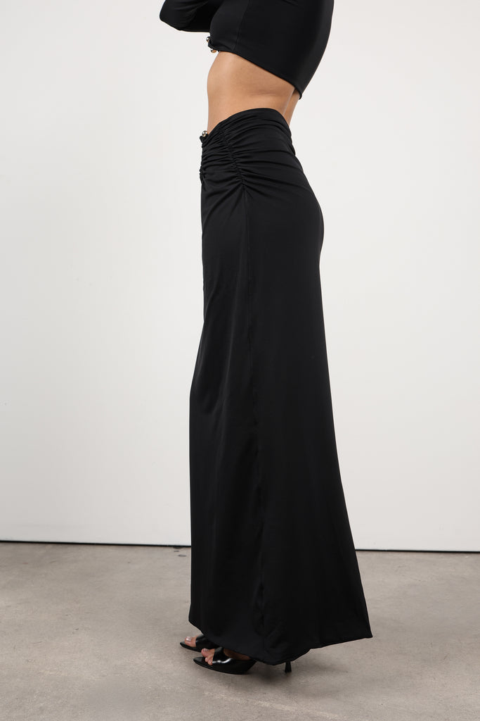 This long skirt features a strategic gathering that enhances the silhouette and a back slit that adds both comfort and a touch of sensuality. Versatile and flattering, it becomes an elevated essential in your wardrobe.