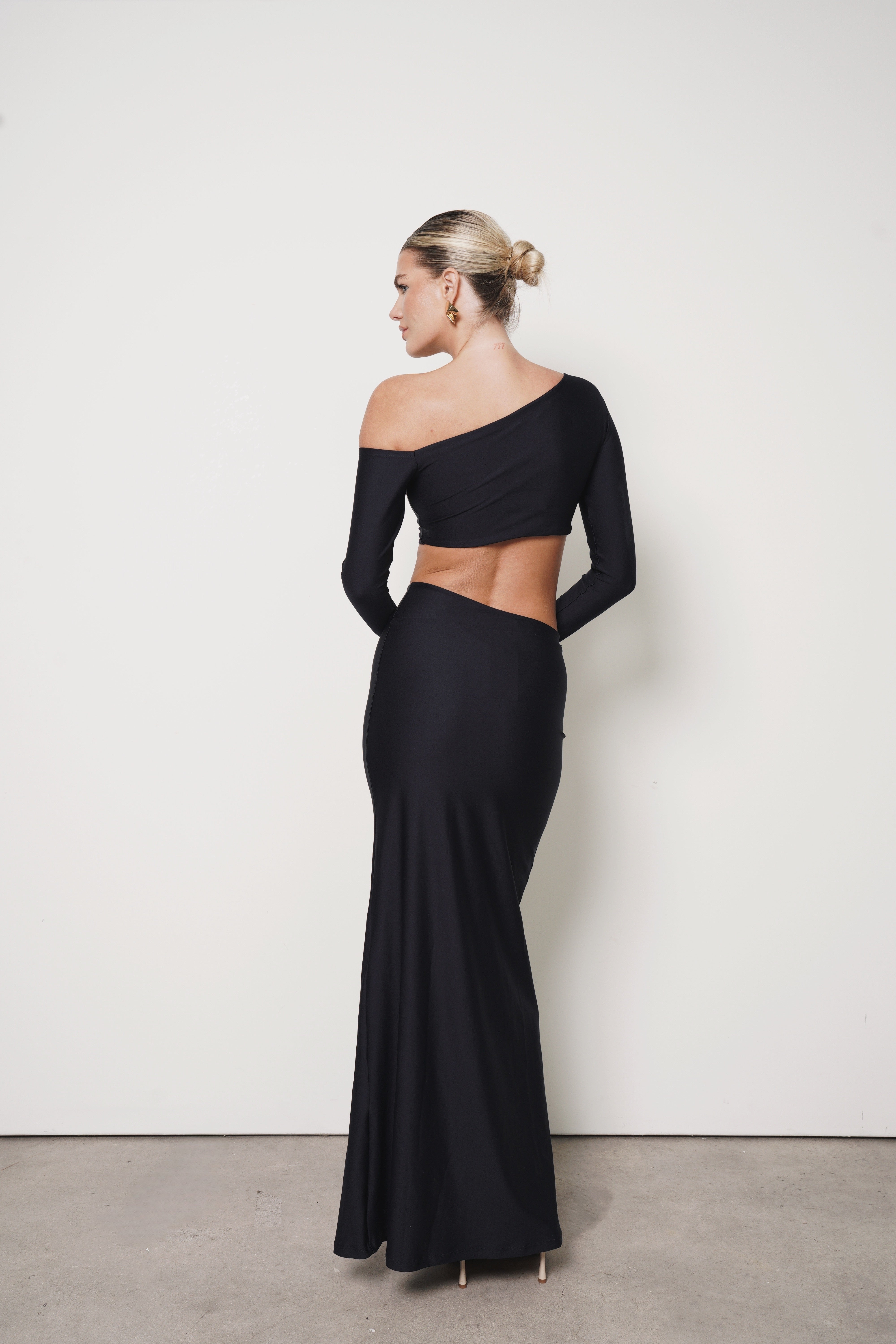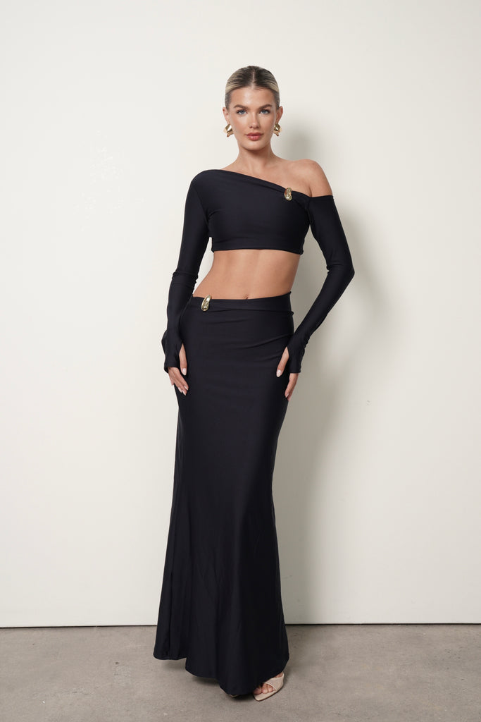 Elegant and refined, this long skirt is crafted from a stretchy fabric that hugs the figure and moves fluidly. The hardware details elevate the design, adding a modern, polished finish that’s perfect for night-time looks or special events.