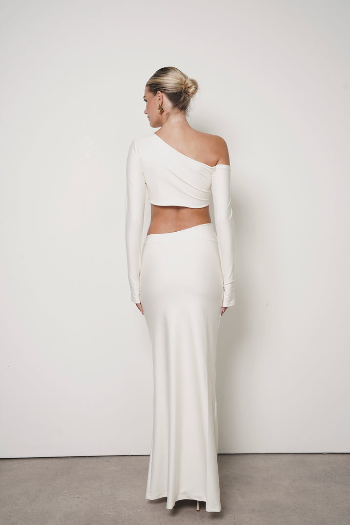 A top designed to stand out. Crafted from a fine, stretchy fabric, this long-sleeve crop top features an asymmetric neckline that leaves one shoulder exposed, creating a modern and sophisticated silhouette. The hardware details add a distinctive touch that elevates any look.