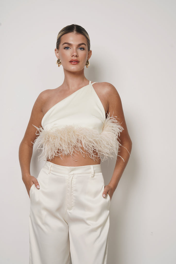 A set designed to turn heads. The halter crop top features feather trimming along the lower hem for a touch of sophisticated shine, while the straight satin pants with feathered hems elevate any look with a glam finish. An elegant, modern combination for special nights.