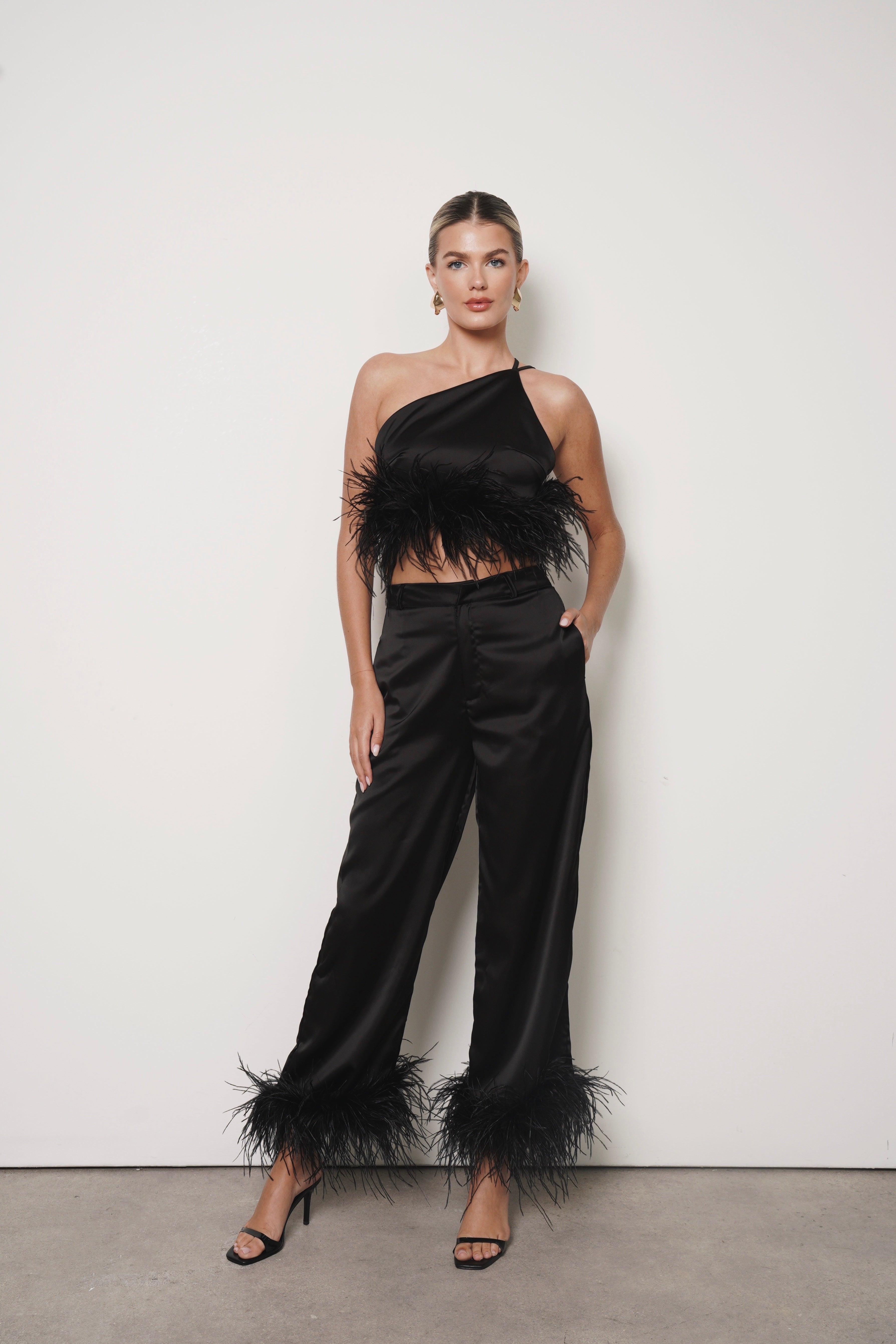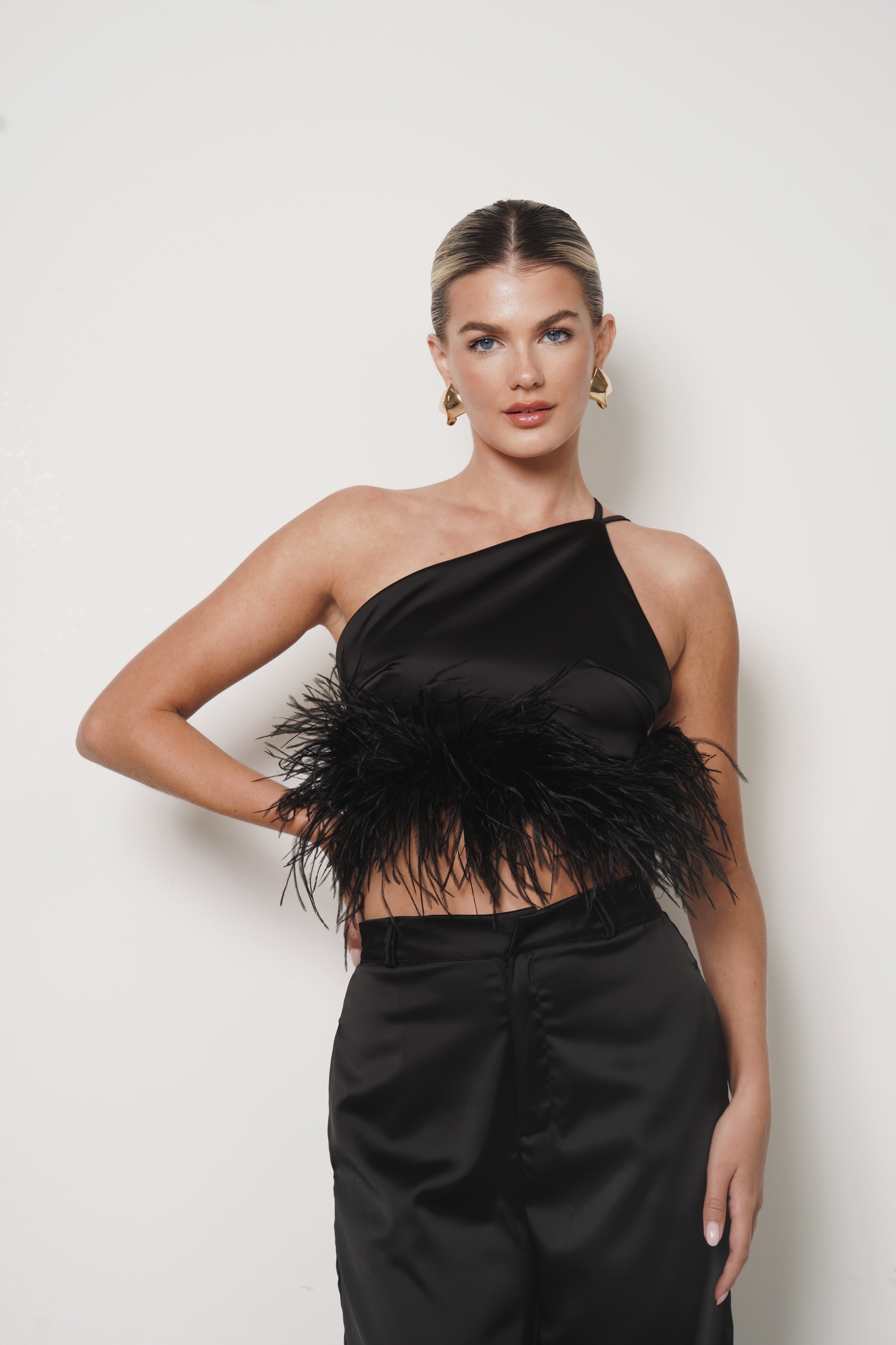 A halter that redefines glamour. Crafted from a soft, luminous fabric, this crop top features feather trimming along the lower hem for a feminine, bold, and sophisticated finish. The perfect piece to elevate your evening looks.