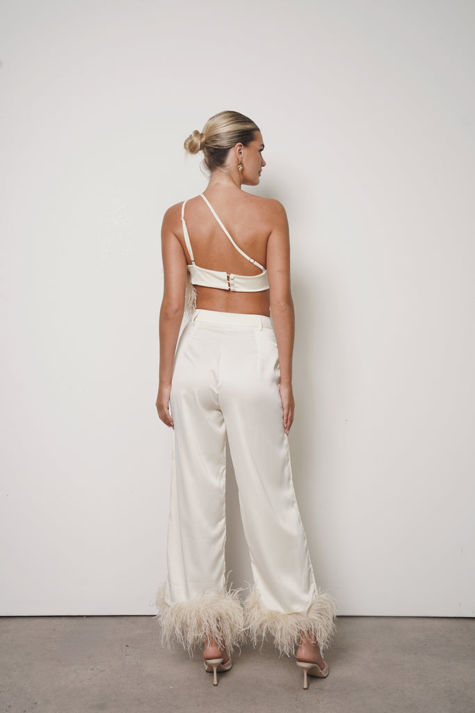 A halter that redefines glamour. Crafted from a soft, luminous fabric, this crop top features feather trimming along the lower hem for a feminine, bold, and sophisticated finish. The perfect piece to elevate your evening looks.