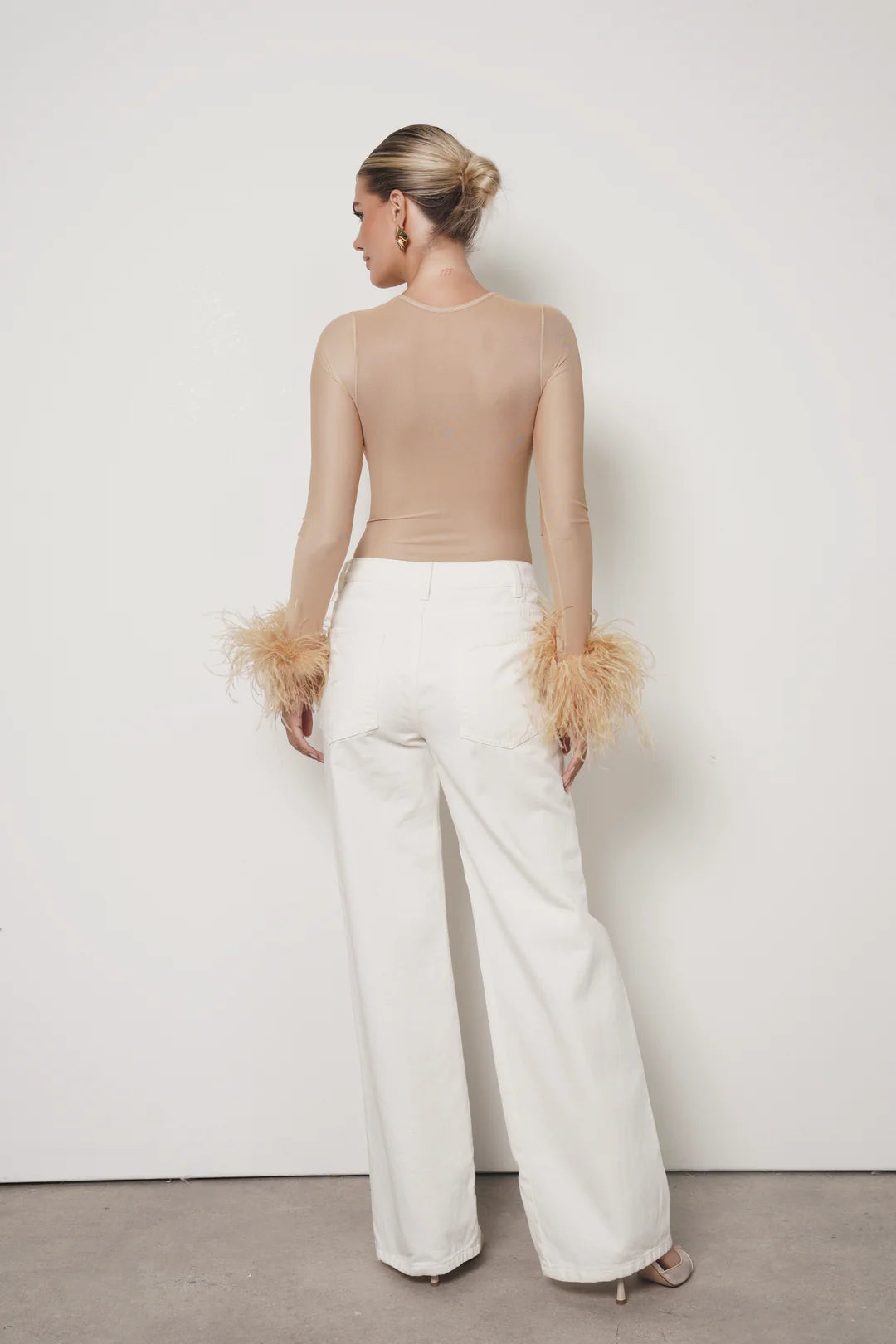 A new edition for lovers of our iconic mesh bodysuit. The Swan Bodysuit blends sensuality and elegance with tone-on-tone feather-trimmed sleeves. Layers of soft mesh are carefully draped to provide more coverage at the front, creating a refined sensuality that flatters the figure, while the sleeves remain sheer for a touch of allure. Its classic single-layer mesh back design enhances the silhouette. The feathers are removable for washing to preserve their quality, as they should not be washed.