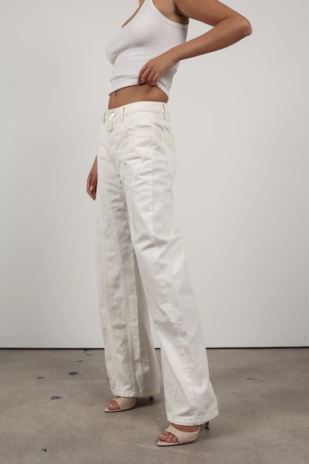 Fresh and modern, this mid-rise wide-leg denim stands out with its unique seam detailing along the legs, designed to visually elongate the silhouette. A timeless, chic piece crafted from premium-quality denim.