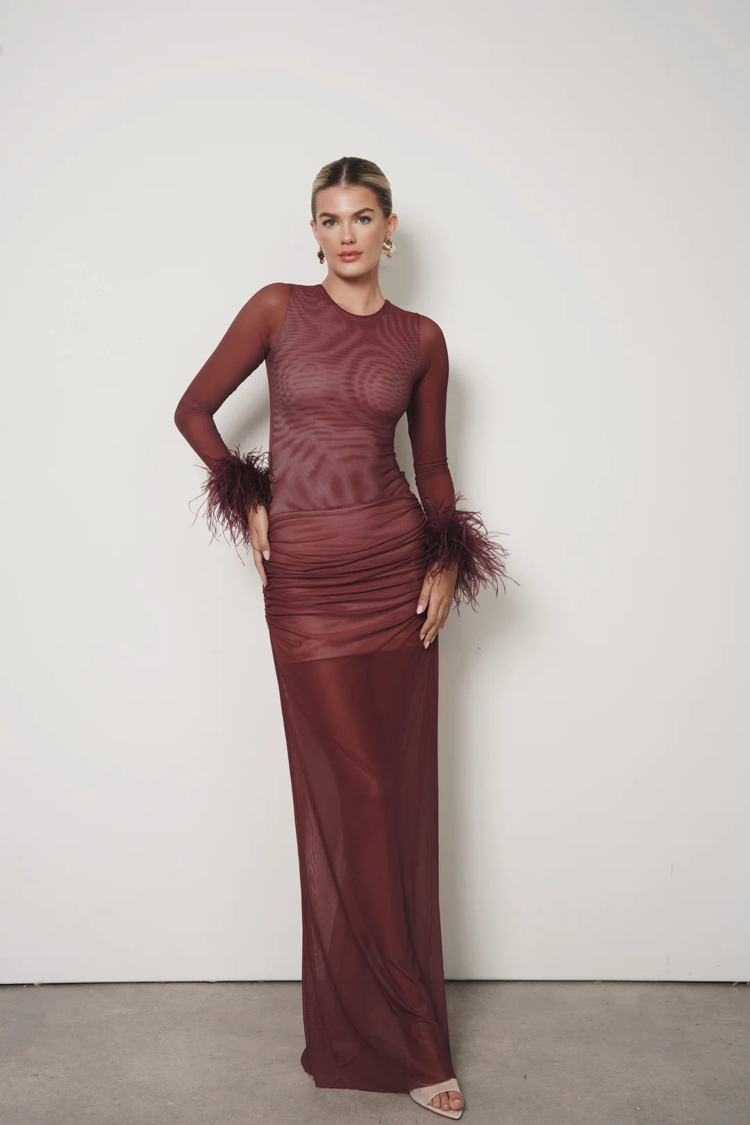 A set that speaks for itself. The feather-accented halter top and mesh skirt create a bold, feminine, and glamorous combination. Perfect for stealing the spotlight, this piece is the definition of confidence and style.