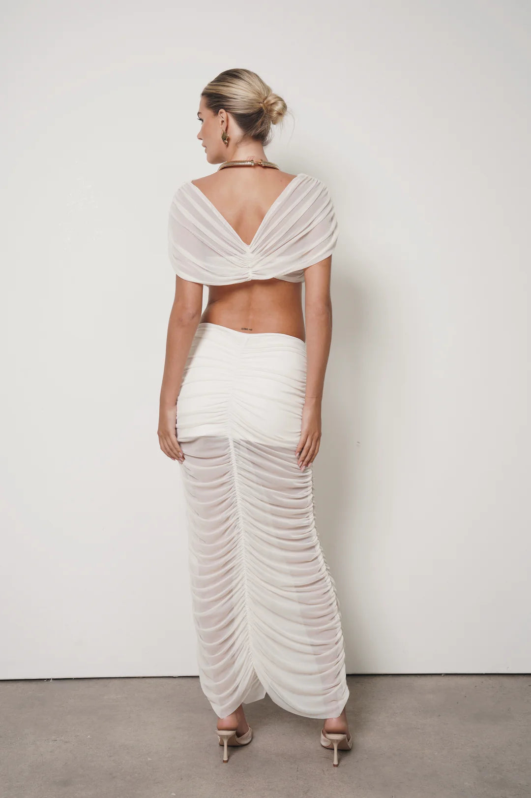 Feminine, sophisticated, and captivating. The Sauvage Set is crafted in mesh and features distinctive draping designed to enhance the figure. The skirt elongates the silhouette with fluid movement, while the draped crop top creates an elegant, powerful shape.