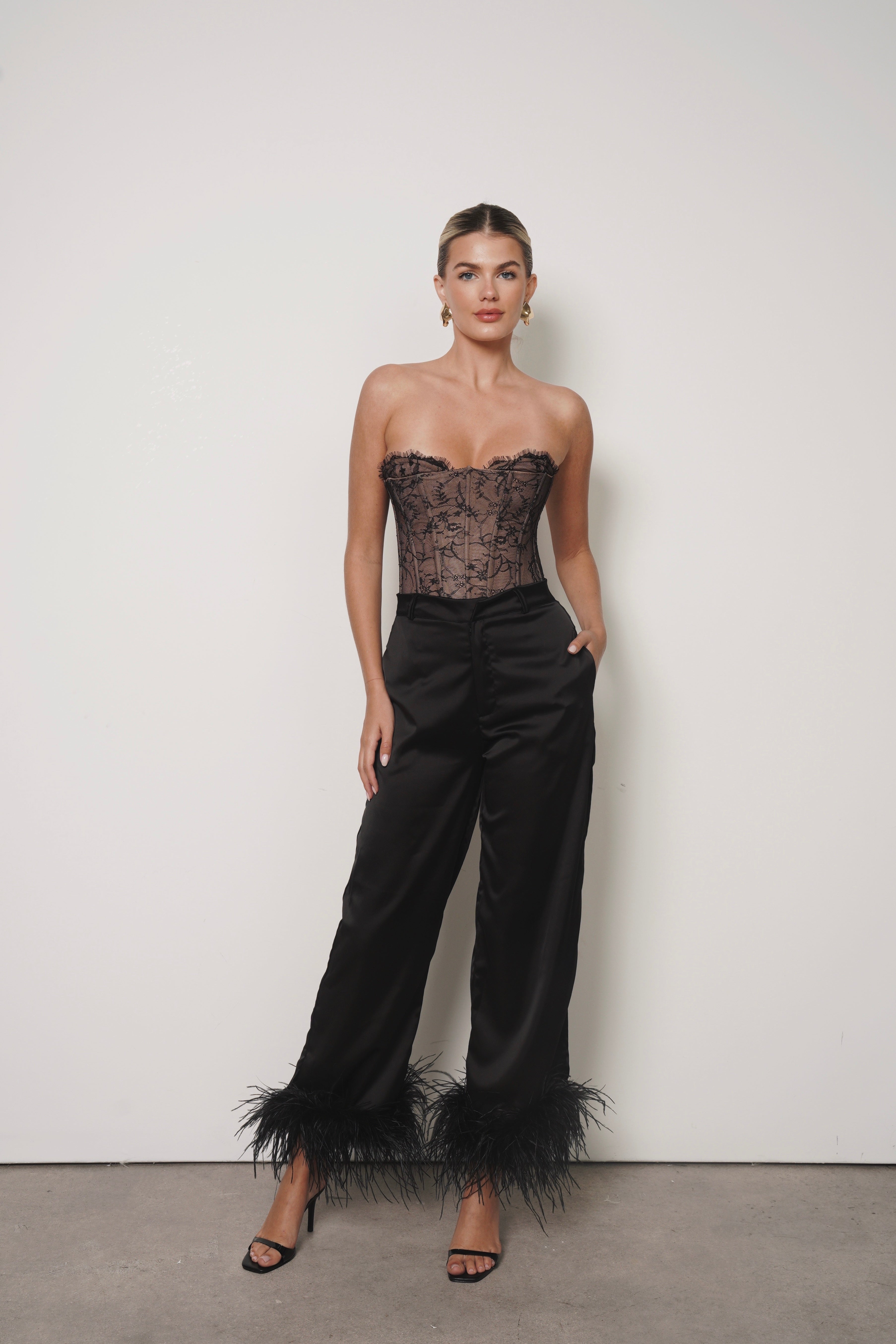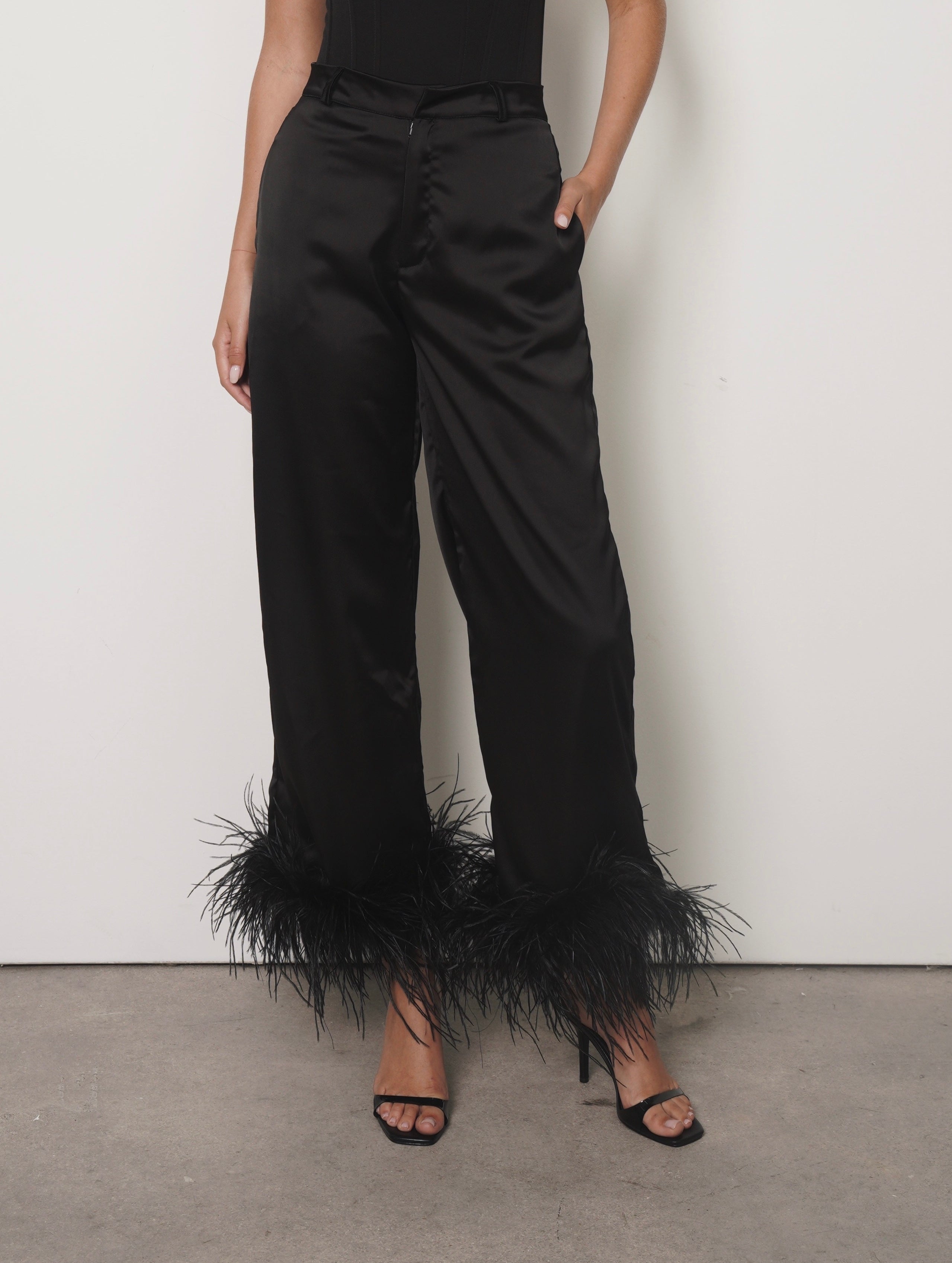 Classic with an unexpected twist. These straight-leg fluid trousers feature feather accents at the hem for a chic, modern finish. Perfect for elevating any look into something elegant and contemporary.